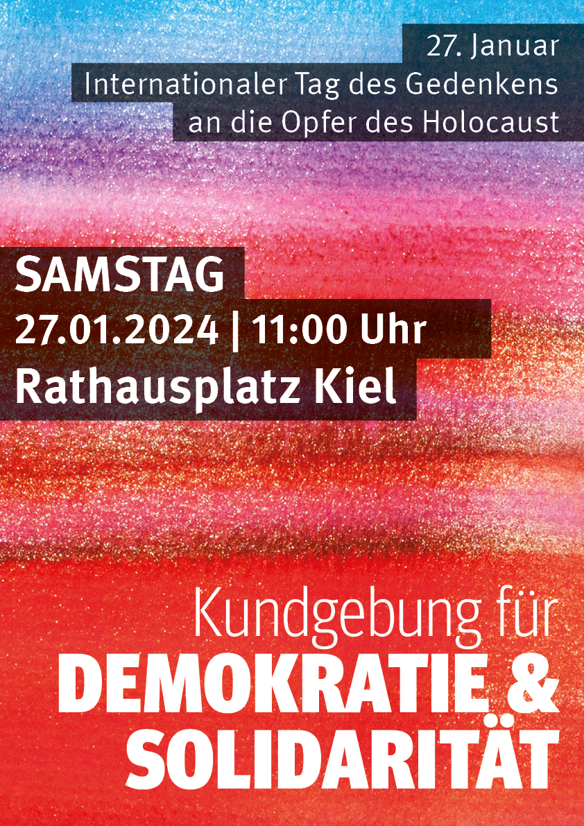 Am Sa., den 27.01.2024 um 11:00 Uhr auf dem Rathausplatz in Kiel zeigen wir gemeinsam Haltung für eine solidarische Gesellschaft und verteidigen gemeinsam unsere Demokratie.